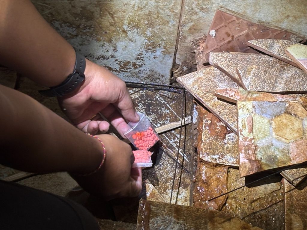 5.ยาเสพติดให้โทษประเภท 1 (เมทแอมเฟตามีนหรือยาบ้า) ไม่สามารถนับจำนวนได้ บรรจุในถุงพลาสติกใสชนิดกดปิดดึงเปิด น้ำหนัก 1.04 กรัม(รวมถุง)