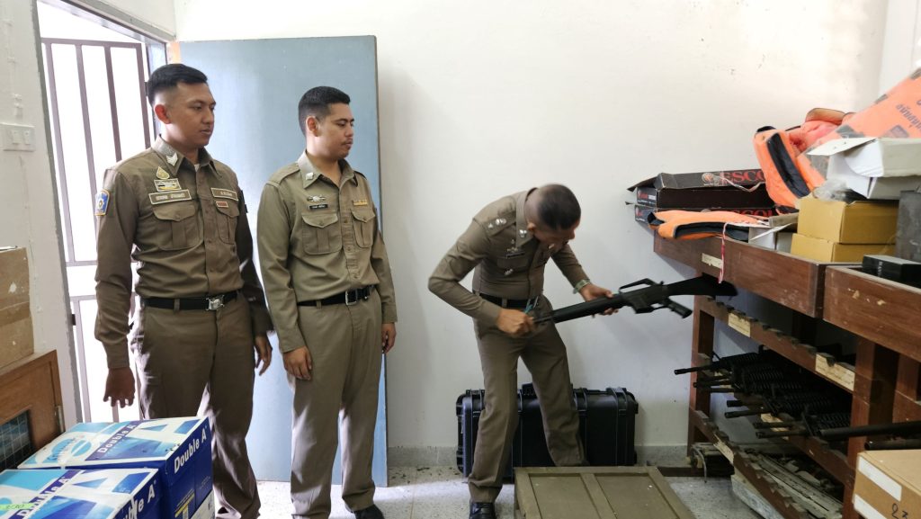 พ.ต.ท.ศักดา อ่อนรักษ์ สว.อก.สภ.เกาะยาว พร้อมเจ้าหน้าที่ที่เกี่ยวข้องตรวจสอบยุทธภัณฑ์ประจำเดือน