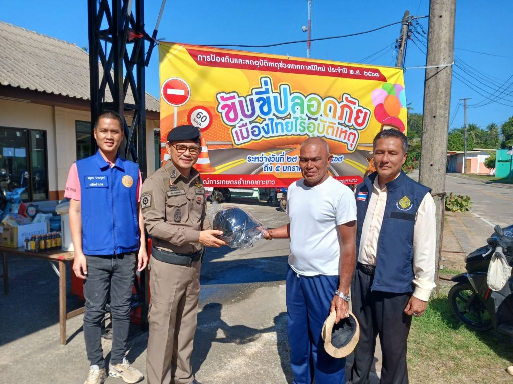 วันที่ 1 ม.ค. 2568 พ.ต.อ.จรัล บางประเสริฐ ผกก.สภ.เกาะยาว พร้อมด้วยเจ้าหน้าที่ฝ่ายปกครอง ,ปลัดอำเภอ, ผู้ใหญ่บ้าน ,อสม.,อป.พร.และเจ้าหน้าที่ตำรวจประจำตั้งจุดบริการประชาชนในช่วงเทศกาลปีใหม่ 2568 ร่วมหมอบหมวกกันน็อคแก่ประชาชน และให้ความรู้เรื่องการกฏจราจร