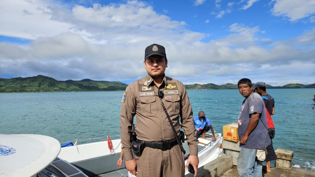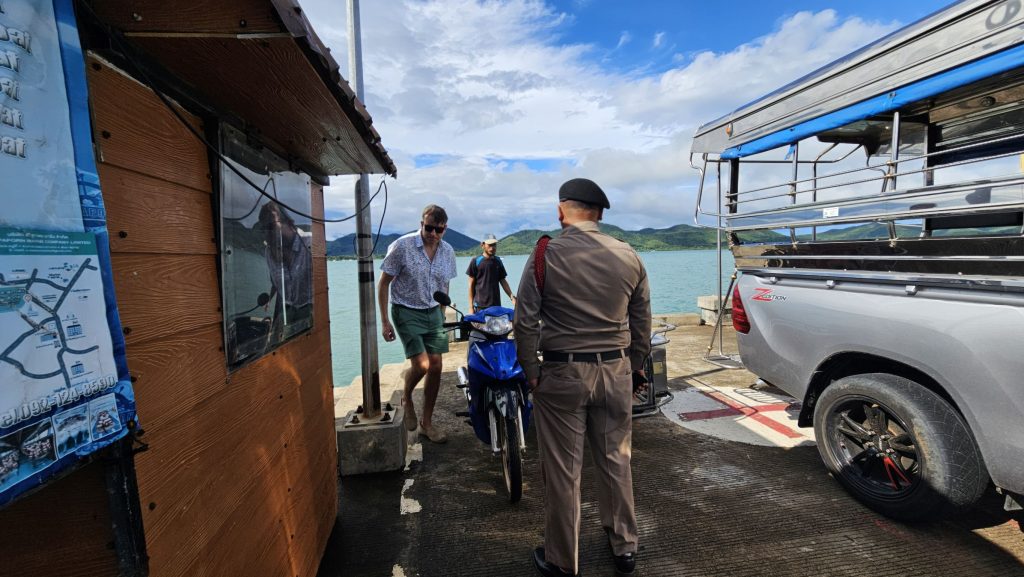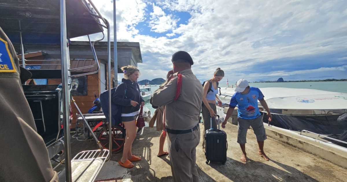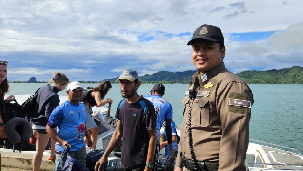 เจ้าหน้าตำรวจจราจร สภ.เกาะยาว จัดระเบียบและอำนวยความจราจรในช่วงที่เรือเข้าเทียบท่าเนื่องจากมีรถรับส่งนักท่องเที่ยวเป็นจำนวนมาก