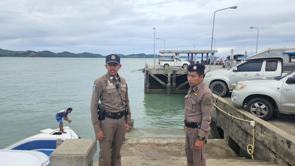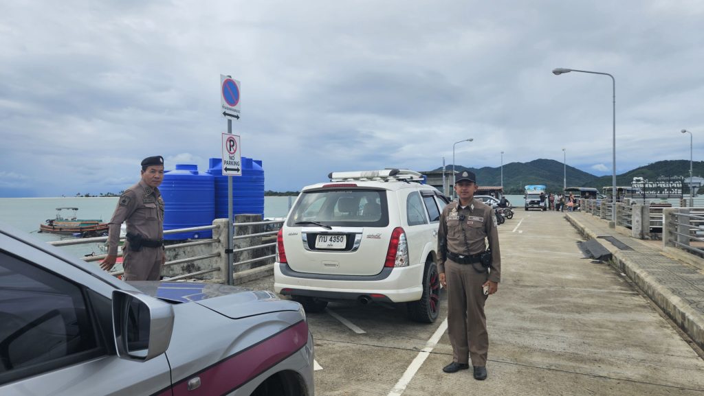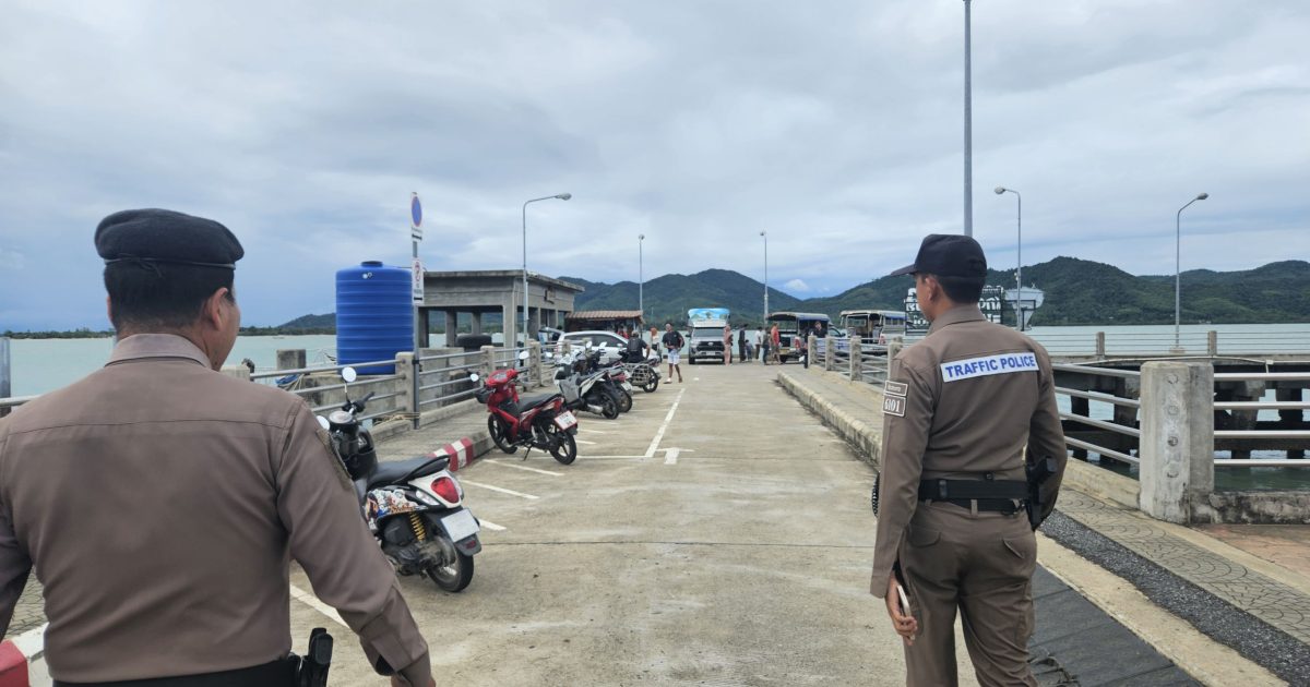 เจ้าหน้าตำรวจจราจร สภ.เกาะยาว จัดระเบียบและอำนวยความจราจรในช่วงที่เรือเข้าเทียบท่าเนื่องจากมีรถรับส่งนักท่องเที่ยวเป็นจำนวนมาก