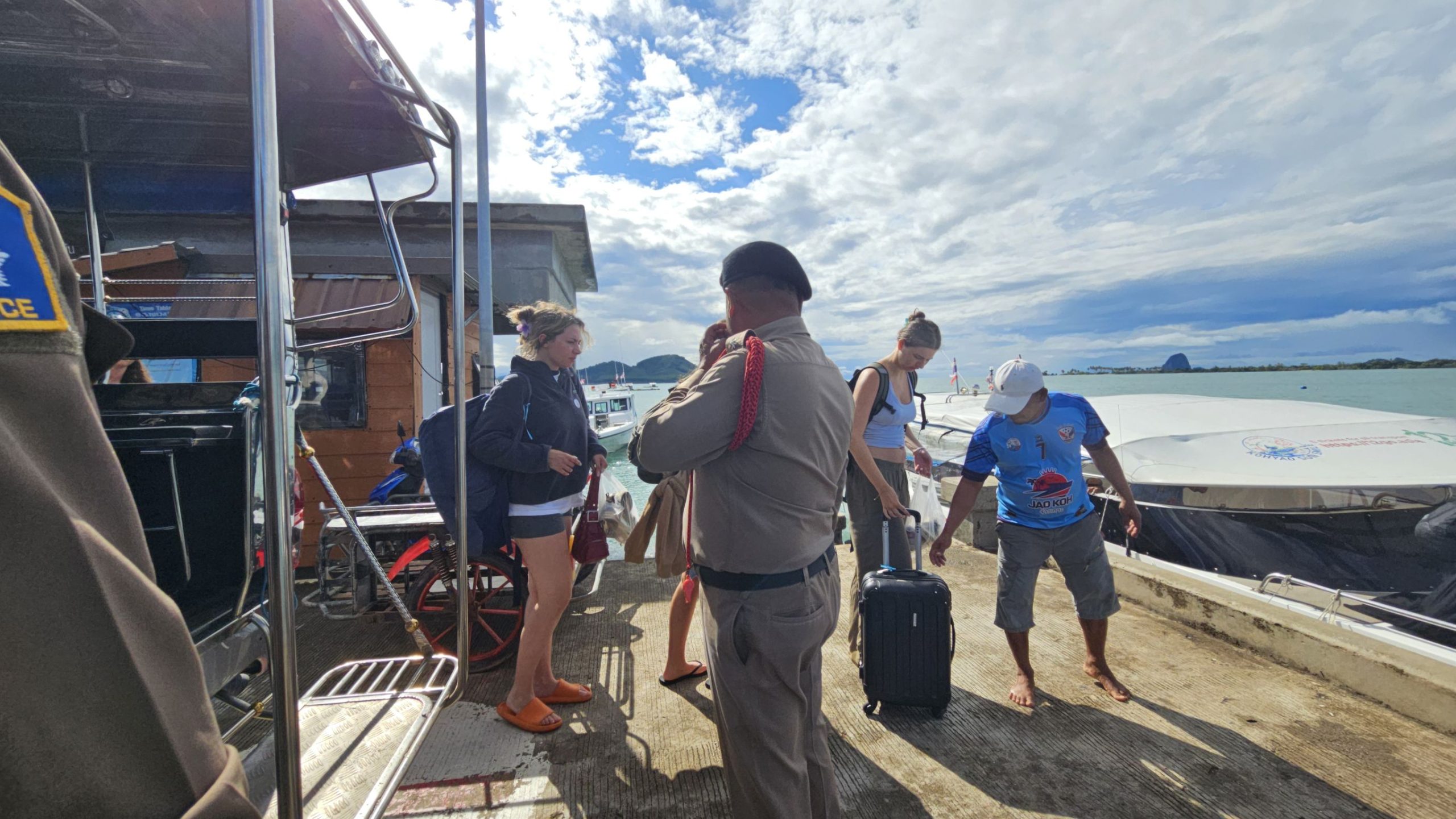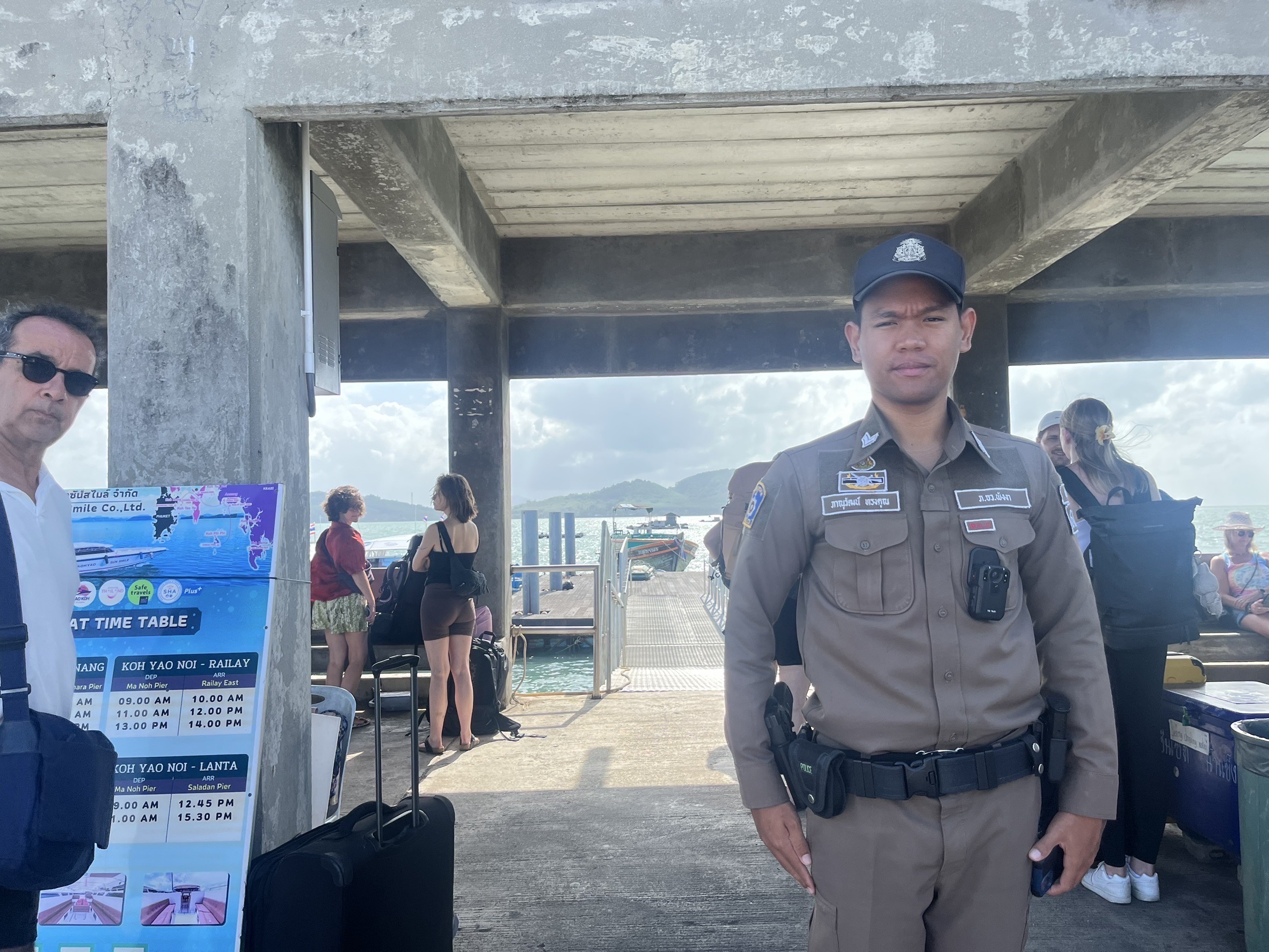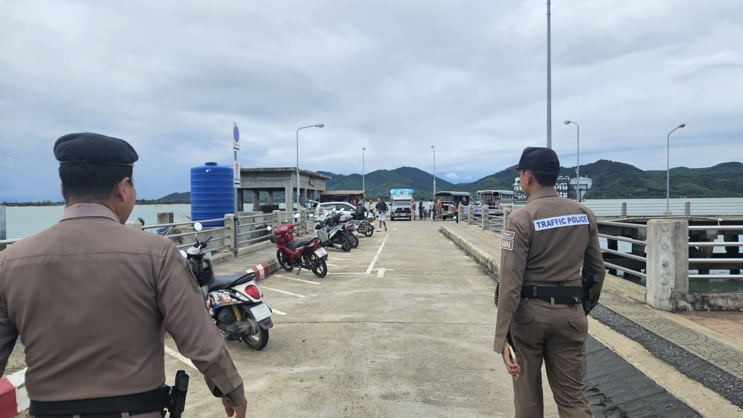 เจ้าหน้าตำรวจจราจร สภ.เกาะยาว จัดระเบียบและอำนวยความจราจรในช่วงที่เรือเข้าเทียบท่าเนื่องจากมีรถรับส่