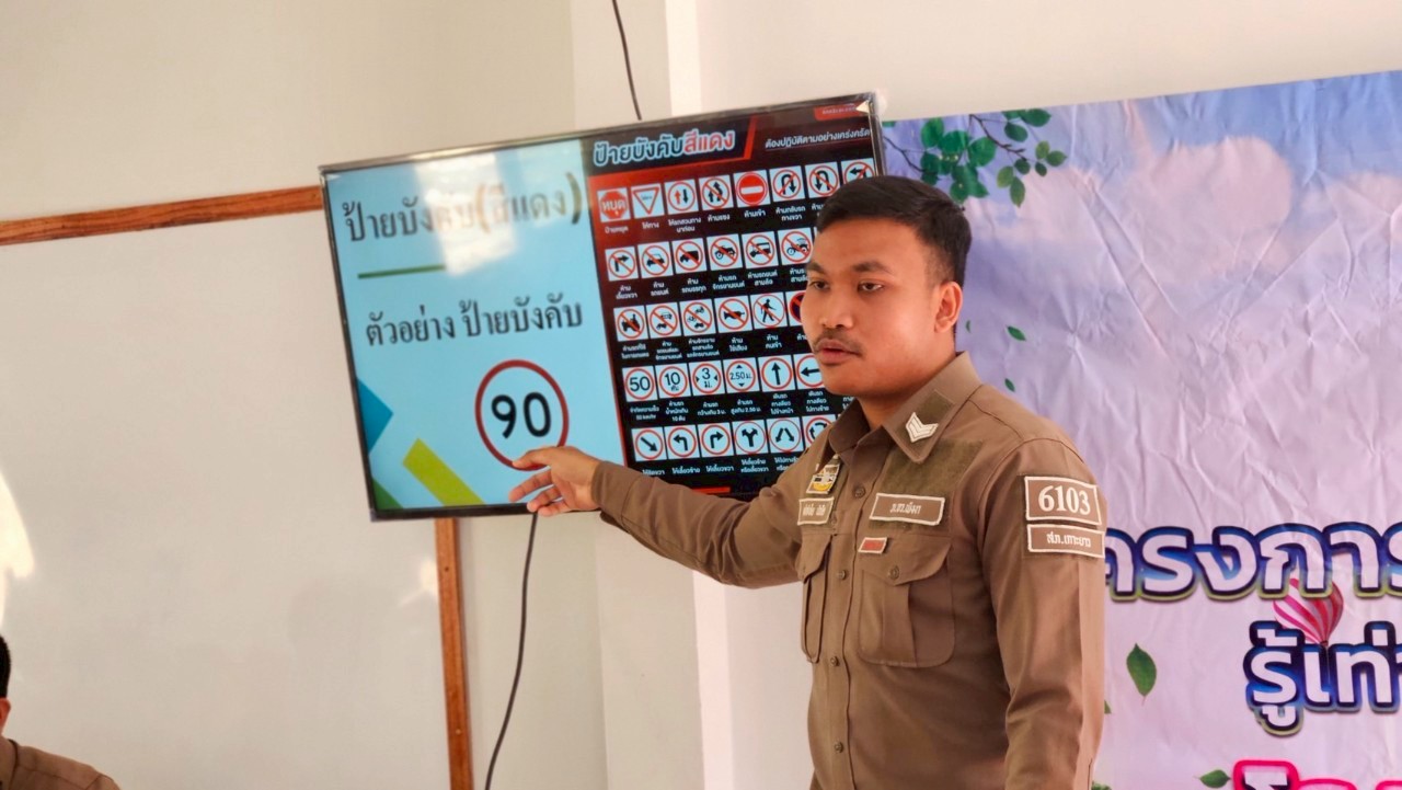 ร.ต.ท.ชาตรี ช่วยมณี รอง สวป.เกาะยาว พร้อมกับเจ้าหน้าที่ตำรวจจราจร สภ.เกาะยาวบรรยายให้ความเรื่องกฏจรา