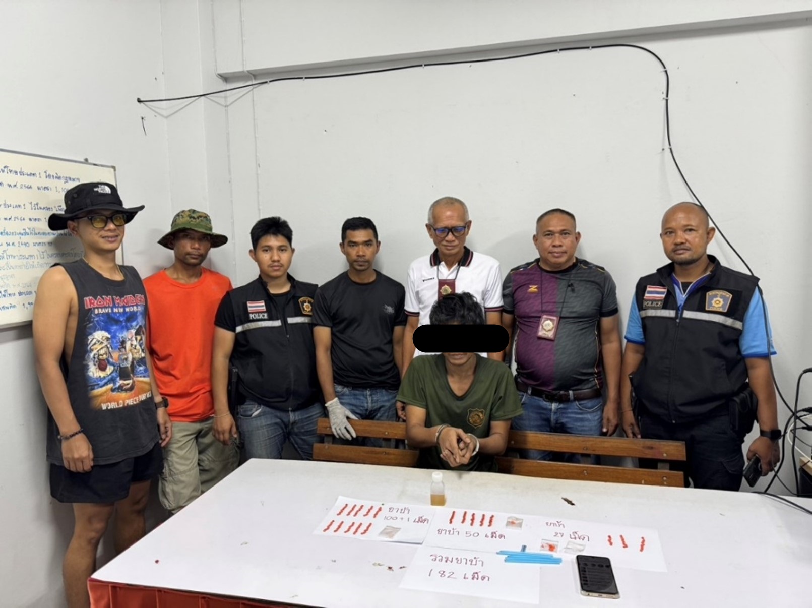 จับกุมยาเสพติดให้โทษประเภท 1 (เมทแอมเฟตามีนหรือยาบ้า) จำนวน 100 เม็ด สีเขียว จำนวน 1 เม็ด รวม 101 เม็ด